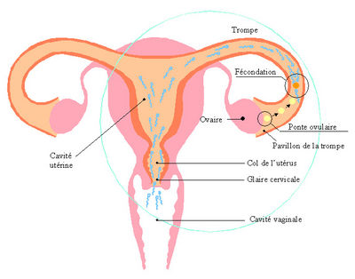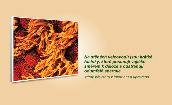 V horní části dělohy se napojují dva vejcovody, což jsou trubice asi 10 až 15 cm dlouhé v průměru přibližně 5 mm. Směrem k vaječníkům se trychtýřovitě rozšiřují a v těchto místech se na stěnách vejcovodů nachází zvláštní prstovité výběžky, které vajíčko zachycují. Stěny vejcovodů jsou pokryty řasinkovým epitelem. Tento svými pohyby připomíná vzrostlé obilí ve větru a tento pohyb řasinek umožňuje posouvání vajíčka směrem k děloze. Druhou důležitou funkcí řasinek je, aby zamezily hromadění mrtvých spermií. Spermie totiž pronikají až do vejcovodů, kde dochází k oplodnění vajíčka. Kromě vítěze zde všechny spermie končí svoji pouť, odumírají a tak nastupuje druhá funkce řasinkového epitelu, a to vypuzování mrtvých spermií z vejcovodů. Nejdůležitějšími pohlavními orgány ženy jsou vaječníky (ovaria), v nichž se vytvářejí vajíčka a ženské pohlavní hormony. Jsou to primární reprodukční orgány, jedná se vlastně o párový orgán. Tvarem připomínají mandle, jsou asi 3 až 5 cm velké a váží kolem 10 g. Každá narozená dívka má již při porodu ve vaječnících daný počet nezralých vajíček, v každém z vaječníků je jich přibližně kolem 2 miliónů. Většina z těchto vajíček během růstu zaniká a na začátku plodného období jich každý vaječník obsahuje asi 100 až 150 tisíc. Z tohoto počtu jich dozraje v každém vaječníku do menopauzy přibližně 250.